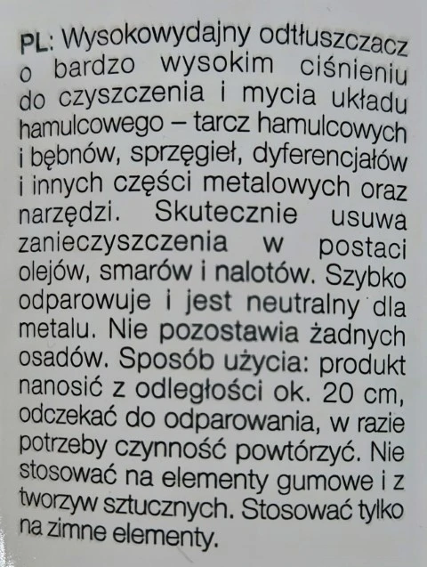 Wysokowydajny odtłuszczacz o bardzo wysokim ciśnieniu do czyszczenia i mycia układu hamulcowego - tarcz hamulcowych i bębnów, sprzęgieł, dyferencjałów i innych części metalowych oraz narzędzi.