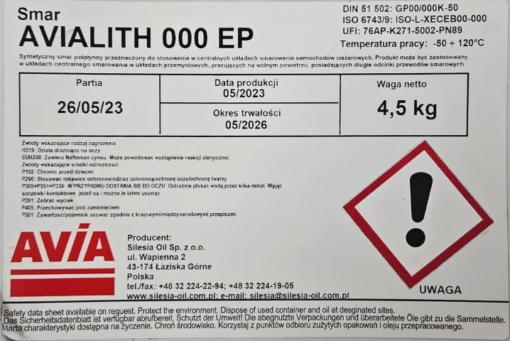 - normy i specyfikacje: DIN 51502: GP00/000K-50; ISO: L-XECEB00/000
