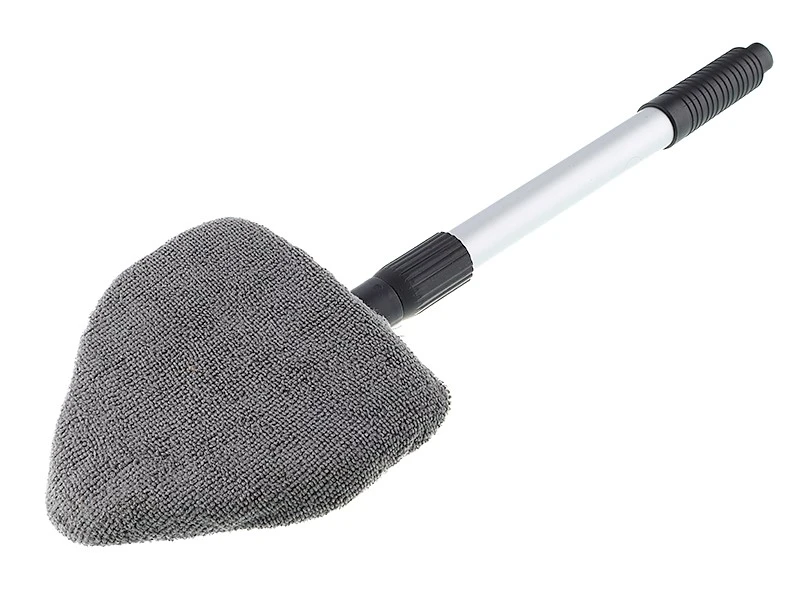 Myjka do szyb wyposażona w wygodny, teleskopowy uchwyt z ruchomą głowicą pokrytą gąbką i mikrofibrą.