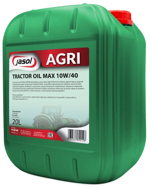 Jasol Agri Tractor Oil Max 10W/40 olej silnikowy typu Ultra High Performance Diesel, zapewniaj膮cy optymaln膮 eksploatacj臋 wysoko obci膮偶onych silnik贸w Diesla. Szczeg贸lnie zalecany jest do silnik贸w: samochod贸w ci臋偶arowych, ci膮gnik贸w siod艂owych, autobus贸w, maszyn drogowych i budowlanych.