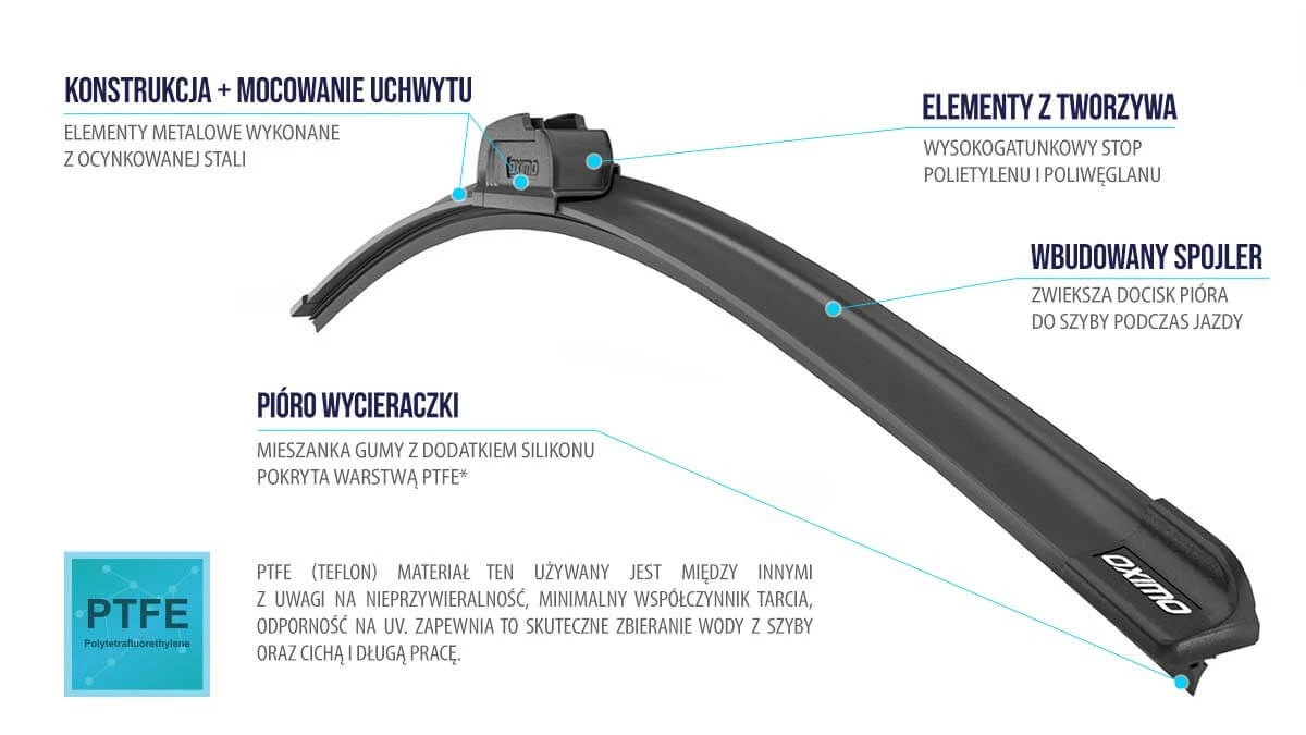 Pióro wycieraczki wykonane z naturalnego kauczuku z dodatkiem silikonu oraz warstwy PTFE (teflon) zapewnia skuteczne zbieranie wody z szyby oraz cichą i długą pracę. Nowoczesna konstrukcja zapewnia równomierny docisk i idealne dopasowanie do krzywizny szyby. Elementy z tworzywa – wysokogatunkowy stop polietylenu i poliwęglanu, elementy metalowe wykonane z ocynkowanej stali, aby długo i skutecznie chronić przed korozją. Łatwy i szybki montaż. Na każde warunki atmosferyczne. Każdy produkt jest poddany gruntownej kontroli jakości.