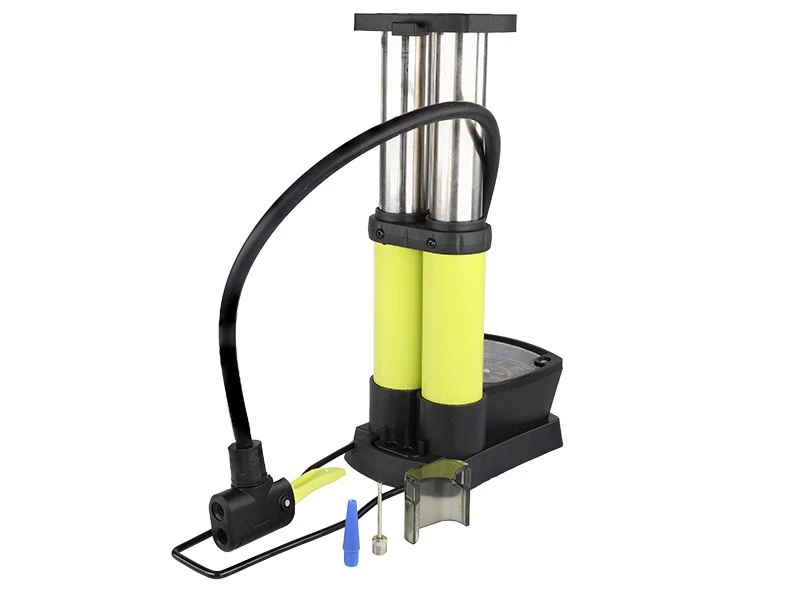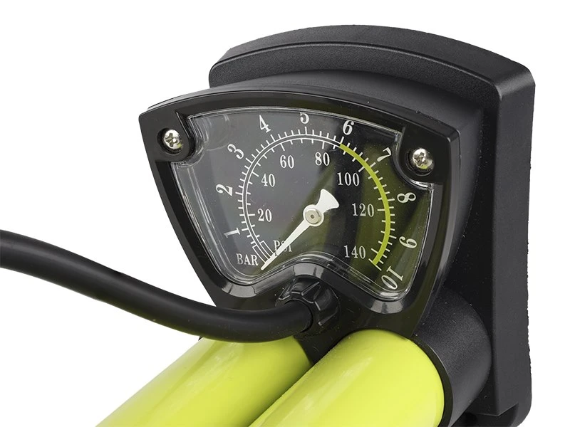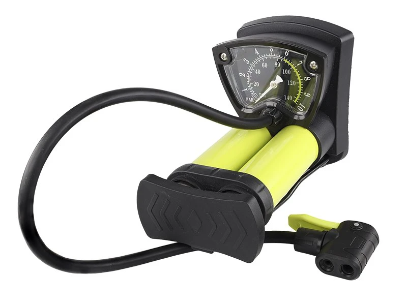 Dwutłokowa pionowa pompka nożna z analogowym ciśnieniomierzem wyskalowanym do 10 BAR (140 PSI).