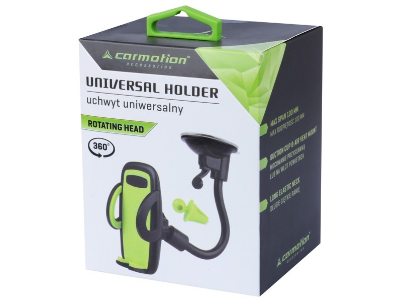 Długie, giętkie ramię pozwoli na idelane dopasowanie uchwytu do samochodu. Mocowany za pomocą przyssawki do płaskiej powierzchni bądź specjalnym zaciskiem na kratce wlotu powietrza. Po kilkukrotnym montażu i demontażu przyssawka może utracić właściwości przyczepne. Należy wtedy przemyć ją ciepłą wodą, aby wyeliminować problem.